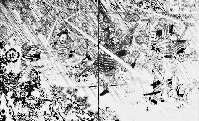 The Imagawa army grew complacent during their break to perform the traditional Head-viewing ceremony in a small wooden ravine called Okehazama.[3] As Nobunaga's men drew silently near, a terrific thunderstorm began which cloaked Nobunaga's final movements as the Imagawa troops huddled under trees from the torrential rain. As the clouds blew away, the Oda troops poured into the gorge of Dengaku - hazama. The Imagawa troops were so unprepared for an attack that they fled in all directions leaving Yoshimoto's curtained field headquarters quite unprotected. Imagawa Yoshimoto had so little knowledge of what was going on that he drew the conclusion that a drunken fight had broken out among the men, and seeing a angry looking samurai running towards him, barked out an order for the man to return to his post. He realized that it was one of Nobunaga's men when the samurai aimed a spear - thrust at him but by then it was too late. Yoshimoto himself drew a sword and cut through the shaft of the spear, but before he could any more a second samurai grabbed him and lopped off his head. All but two senior officers of the Imagawa were killed.[4] Hattori Koehita, one of Nobunaga’s men, pierced Yoshimoto with a spear, and Mōri Yoshikatsu, also one of Nobunaga’s men, killed Yoshimoto. It took Nobunaga only two hours to get the victory.[5]